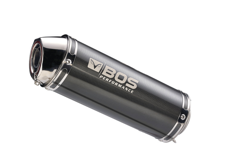 2 Silencieux Bos Rond Ø100 Midget Hyper inox finition apparence carbone, superbe!, longueur 250 (320 hors tout avec coupelle) homologué avec chicane amovible